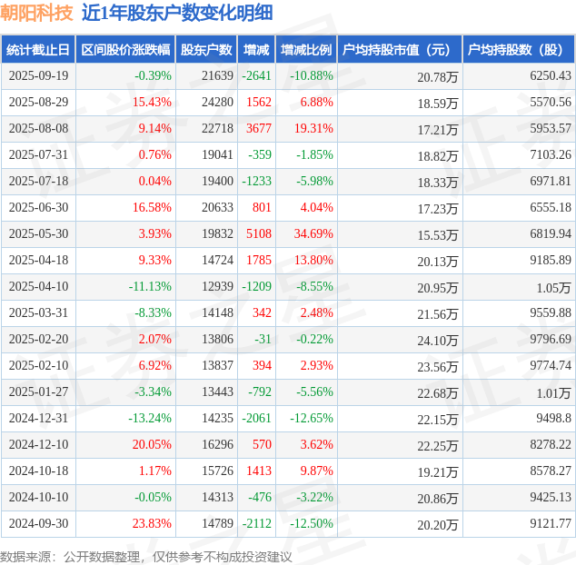 从股价来看,2025年8月29日至2025年9月19日,朝阳科技区间跌幅为0.39%,在此期间股东户数减少2641.0户,减幅为10.88%。