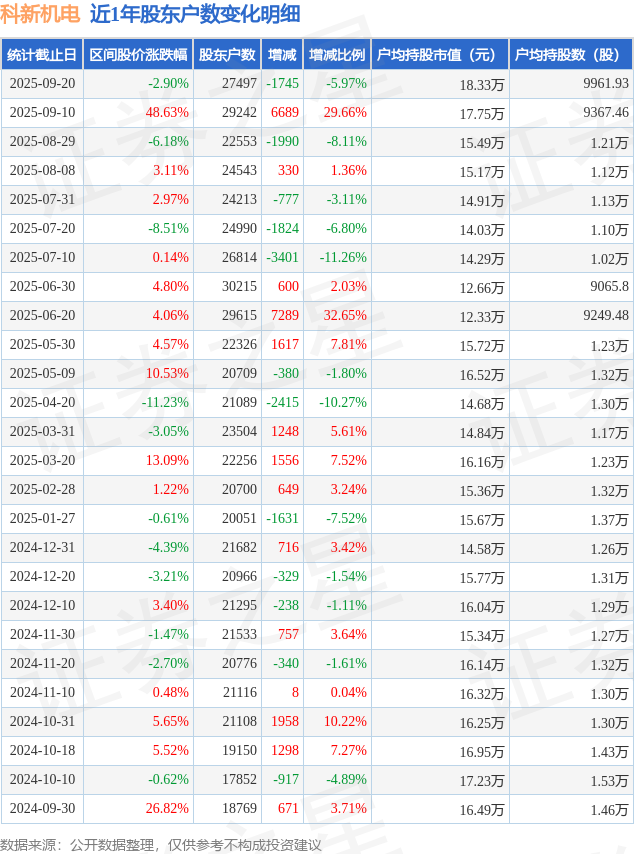 从股价来看,2025年9月10日至2025年9月20日,科新机电区间跌幅为2.9%,在此期间股东户数减少1745.0户,减幅为5.97%。
