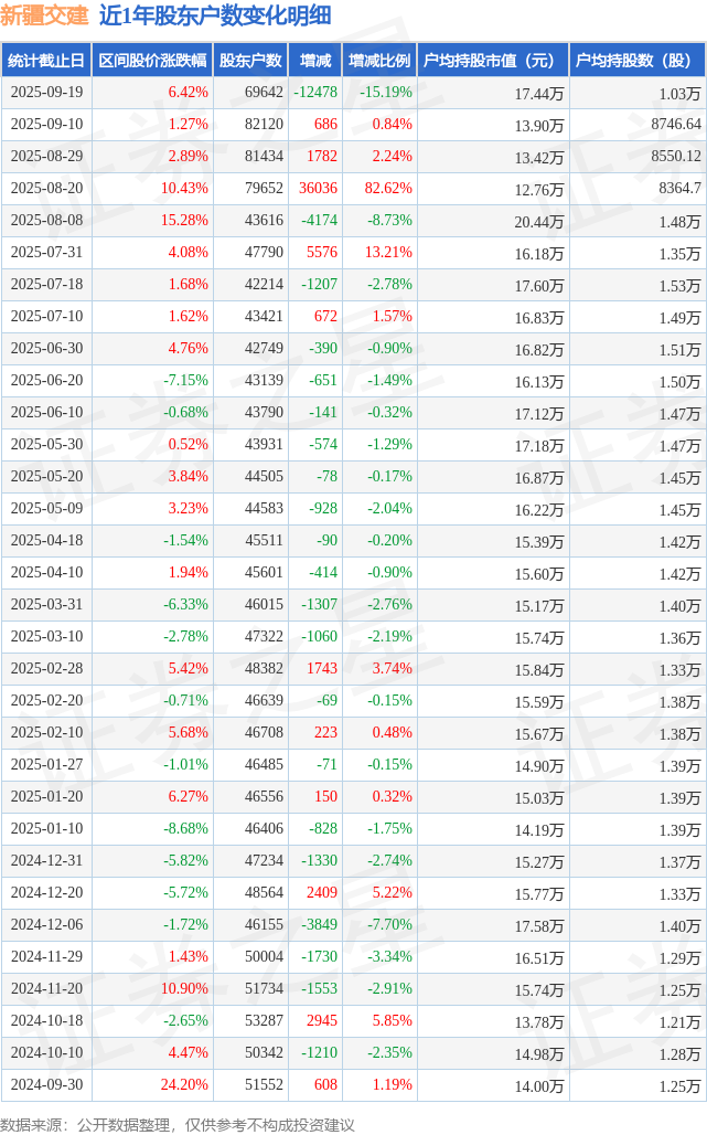 从股价来看,2025年9月10日至2025年9月19日,新疆交建区间涨幅为6.42%,在此期间股东户数减少1.25万户,减幅为15.19%。