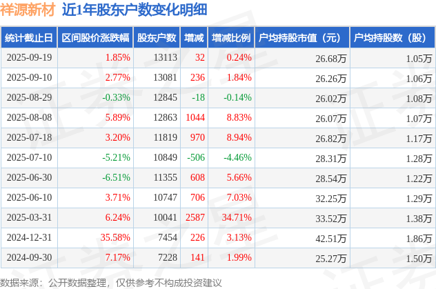 从股价来看,2025年9月10日至2025年9月19日,祥源新材区间涨幅为1.85%,在此期间股东户数增加32.0户,增幅为0.24%。