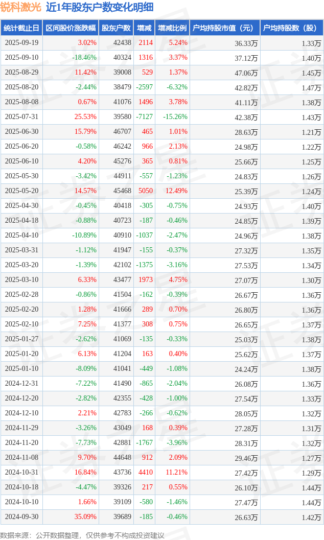 从股价来看,2025年9月10日至2025年9月19日,锐科激光区间涨幅为3.02%,在此期间股东户数增加2114.0户,增幅为5.24%。