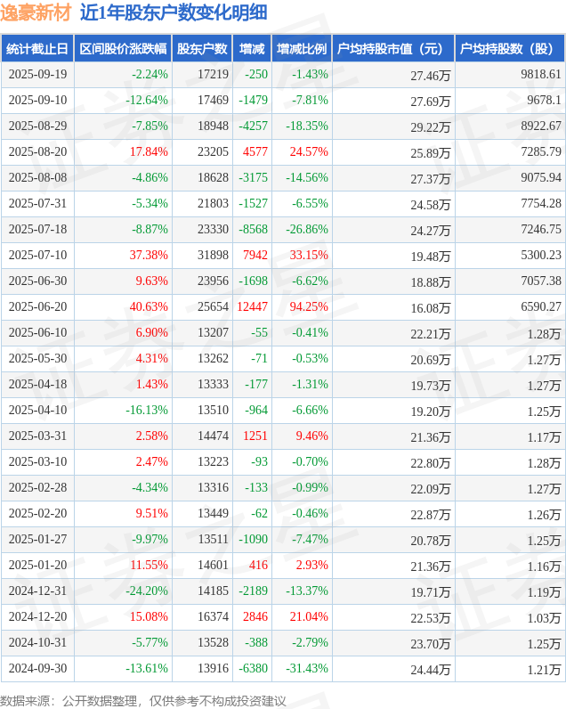 从股价来看,2025年9月10日至2025年9月19日,逸豪新材区间跌幅为2.24%,在此期间股东户数减少250.0户,减幅为1.43%。