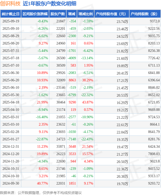 从股价来看,2025年9月10日至2025年9月19日,创识科技区间跌幅为0.43%,在此期间股东户数减少354.0户,减幅为1.59%。