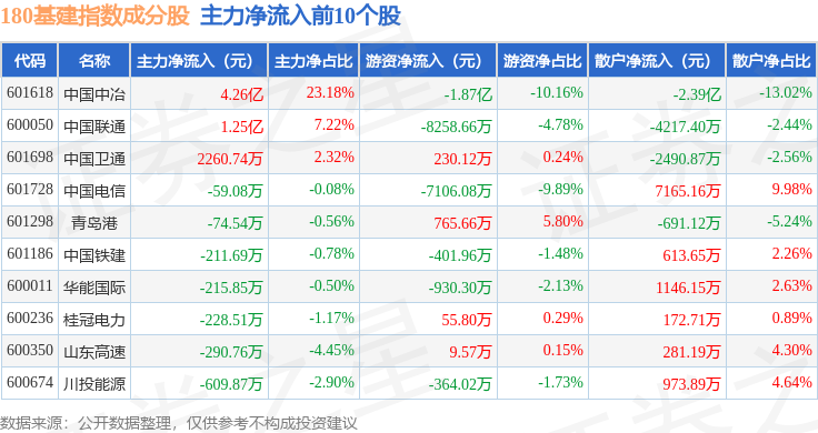 资金流向方面,180基建(000025)指数成份股当日主力资金净流出合计3.5亿元,游资资金净流出合计1.07亿元,散户资金净流入合计4.57亿元。成份股资金流向详情见下表:
