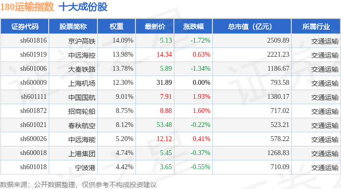 180运输(000027)指数十大成份股详情如下: