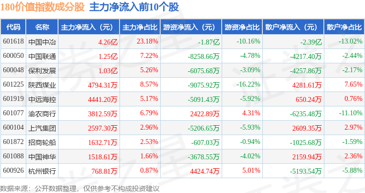 资金流向方面,180价值(000029)指数成份股当日主力资金净流出合计89.58亿元,游资资金净流入合计40.22亿元,散户资金净流入合计49.35亿元。成份股资金流向详情见下表: