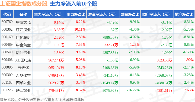 资金流向方面,上证国企(000056)指数成份股当日主力资金净流出合计72.65亿元,游资资金净流入合计34.59亿元,散户资金净流入合计38.06亿元。成份股资金流向详情见下表: