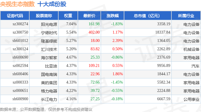 证券之星消息,9月30日,央视生态(399556)指数报收于2857.51点,涨0.82%,成交1049.97亿元,换手率1.21%。当日该指数成份股中,上涨的有20家,亿纬锂能以8.75%的涨幅领涨,下跌的有30家,惠城环保以11.71%的跌幅领跌。