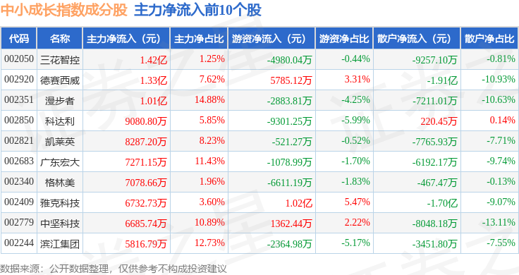 资金流向方面,中小成长(399602)指数成份股当日主力资金净流出合计46.65亿元,游资资金净流入合计13.31亿元,散户资金净流入合计33.34亿元。成份股资金流向详情见下表: