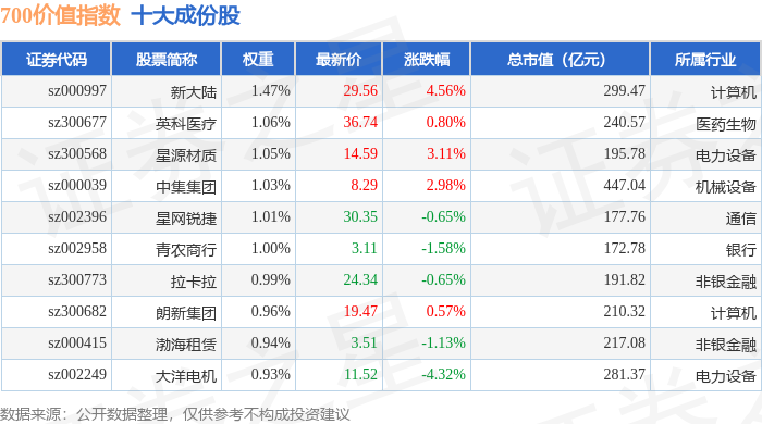 证券之星消息,9月30日,700价值(399629)指数报收于2860.67点,涨0.23%,成交626.97亿元,换手率2.09%。当日该指数成份股中,上涨的有102家,信邦制药以10.14%的涨幅领涨,下跌的有121家,城发环境以4.96%的跌幅领跌。