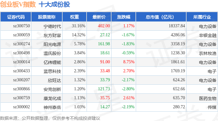 证券之星消息,9月30日,创业板V(399668)指数报收于5612.34点,涨0.67%,成交1196.91亿元,换手率3.3%。当日该指数成份股中,上涨的有61家,亿纬锂能以8.75%的涨幅领涨,下跌的有37家,华致酒行以3.43%的跌幅领跌。