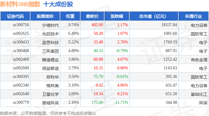 证券之星消息,9月30日,新材料50R(470042)指数报收于4075.54点,涨1.72%,成交1031.13亿元,换手率4.77%。当日该指数成份股中,上涨的有38家,富临精工以19.98%的涨幅领涨,下跌的有12家,惠城环保以11.71%的跌幅领跌。