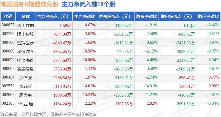 资金流向方面,湾区服务R(480011)指数成份股当日主力资金净流出合计20.28亿元,游资资金净流入合计4.47亿元,散户资金净流入合计15.8亿元。成份股资金流向详情见下表: