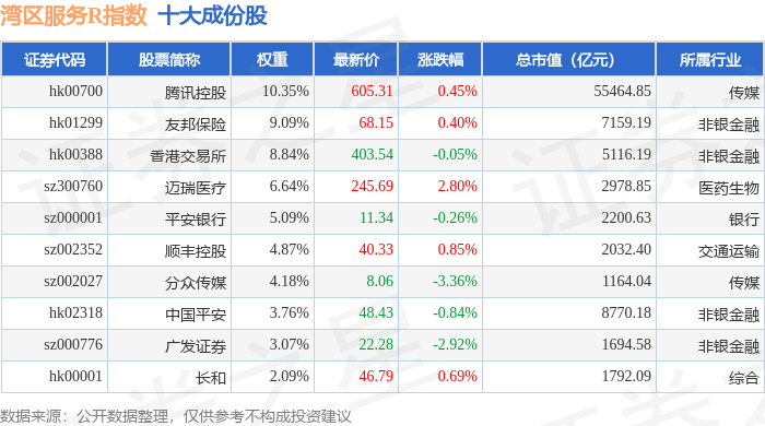 证券之星消息,9月30日,湾区服务R(480011)指数报收于2789.54点,涨0.23%,成交561.09亿元。当日该指数成份股中,上涨的有58家,药师帮以13.16%的涨幅领涨,下跌的有41家,分众传媒以3.36%的跌幅领跌。