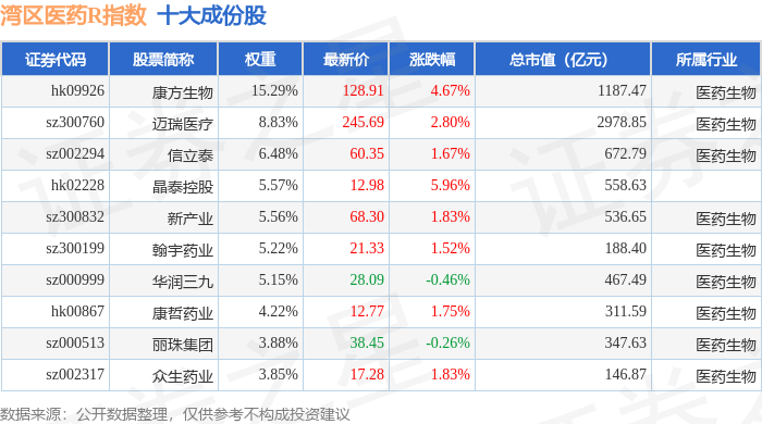 湾区医药R(480013)指数十大成份股详情如下: