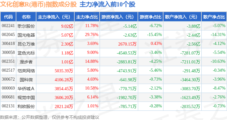 资金流向方面,文化创意R(港币)(480047)指数成份股当日主力资金净流入合计6.97亿元,游资资金净流出合计1.29亿元,散户资金净流出合计5.68亿元。成份股资金流向详情见下表:
