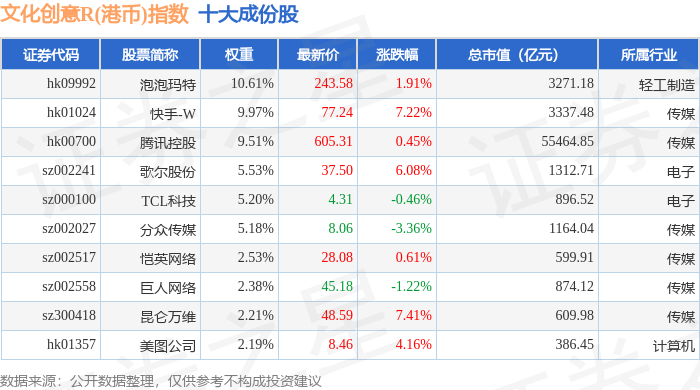 文化创意R(港币)(480047)指数十大成份股详情如下: