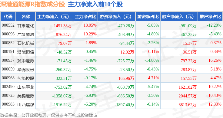 资金流向方面,深港通能源R(483013)指数成份股当日主力资金净流出合计1.35亿元,游资资金净流出合计3121.87万元,散户资金净流入合计1.66亿元。成份股资金流向详情见下表: