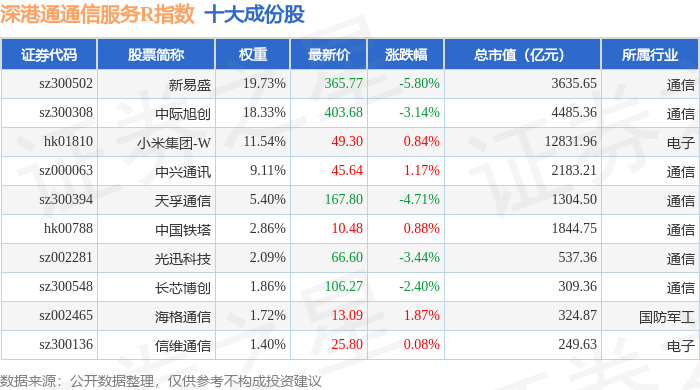 深港通通信服务R(483033)指数十大成份股详情如下: