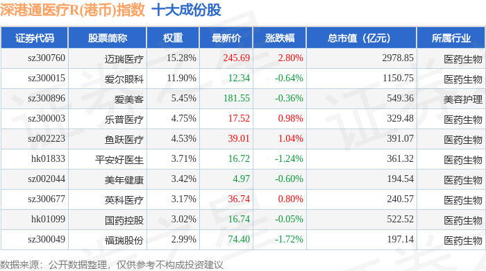 深港通医疗R(港币)(483036)指数十大成份股详情如下:
