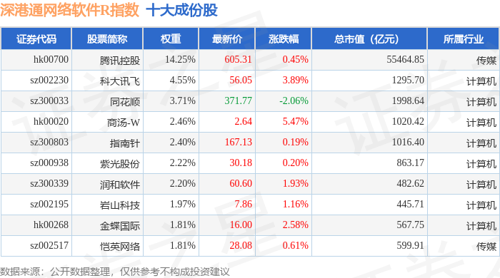 深港通网络软件R(483047)指数十大成份股详情如下: