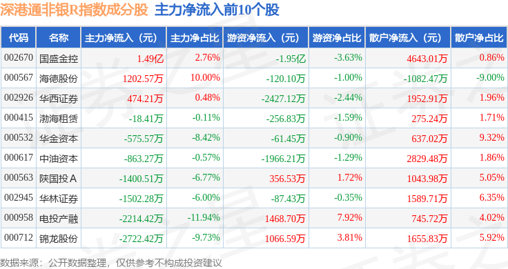 资金流向方面,深港通非银R(483053)指数成份股当日主力资金净流出合计33.12亿元,游资资金净流入合计8.81亿元,散户资金净流入合计24.31亿元。成份股资金流向详情见下表: