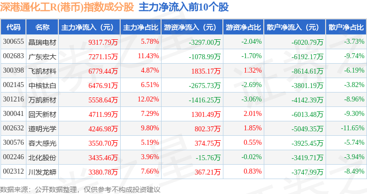 资金流向方面,深港通化工R(港币)(483064)指数成份股当日主力资金净流出合计5.69亿元,游资资金净流入合计7167.13万元,散户资金净流入合计4.97亿元。成份股资金流向详情见下表: