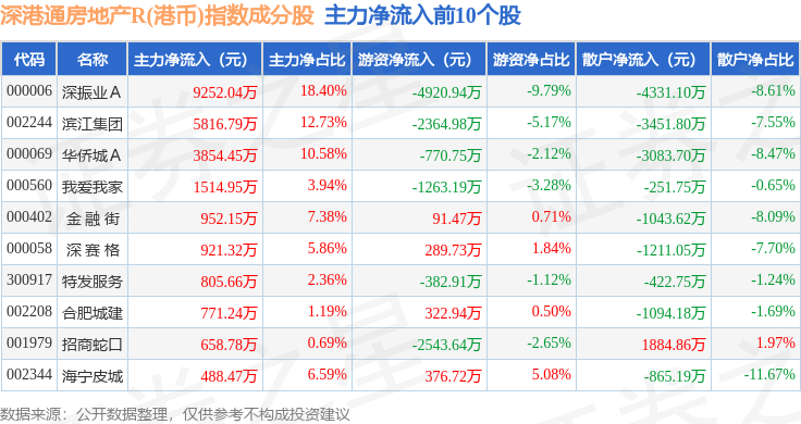 资金流向方面,深港通房地产R(港币)(483072)指数成份股当日主力资金净流入合计1.72亿元,游资资金净流出合计8814.01万元,散户资金净流出合计8402.25万元。成份股资金流向详情见下表: