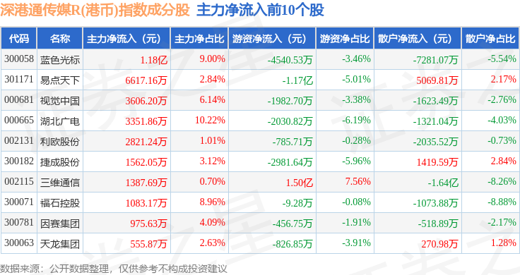 资金流向方面,深港通传媒R(港币)(483076)指数成份股当日主力资金净流出合计5.11亿元,游资资金净流入合计1.54亿元,散户资金净流入合计3.56亿元。成份股资金流向详情见下表: