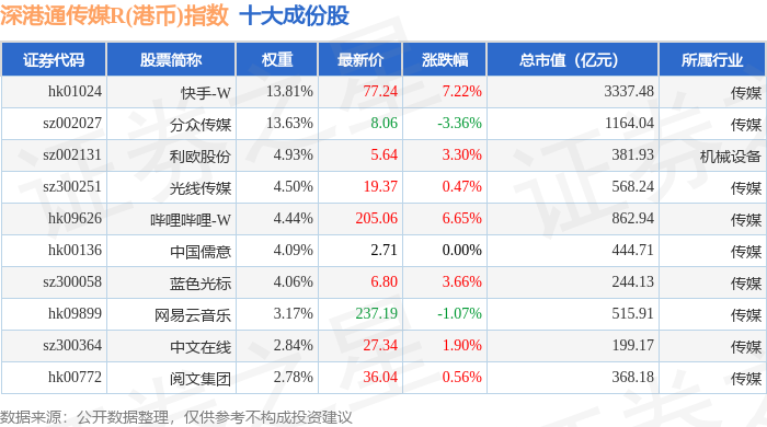 深港通传媒R(港币)(483076)指数十大成份股详情如下: