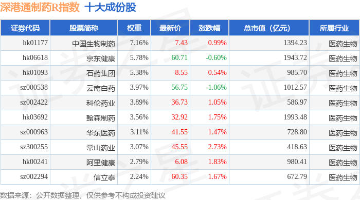 深港通制药R(483079)指数十大成份股详情如下: