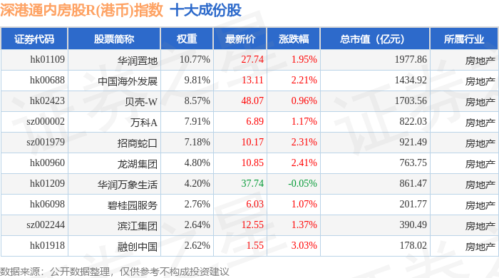 深港通内房股R(港币)(483084)指数十大成份股详情如下: