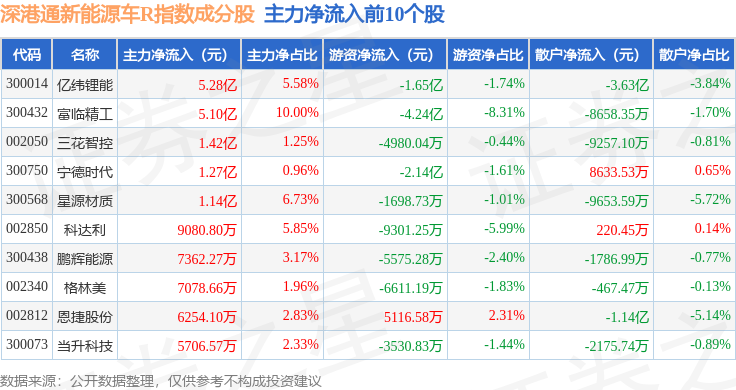 资金流向方面,深港通新能源车R(483087)指数成份股当日主力资金净流出合计24.64亿元,游资资金净流出合计7645.64万元,散户资金净流入合计25.41亿元。成份股资金流向详情见下表: