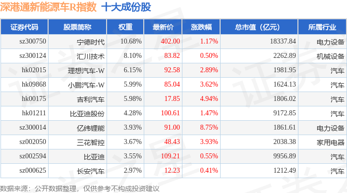 深港通新能源车R(483087)指数十大成份股详情如下: