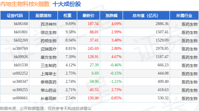 证券之星消息,9月30日,内地生物科技R(483101)指数报收于3742.88点,涨2.47%,成交228.25亿元。当日该指数成份股中,上涨的有42家,药明康德以8.11%的涨幅领涨,下跌的有7家,泰格医药以1.21%的跌幅领跌。