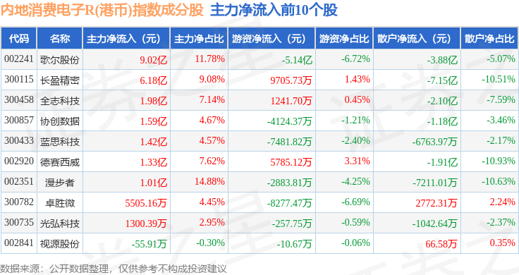 资金流向方面,内地消费电子R(港币)(483106)指数成份股当日主力资金净流出合计46.52亿元,游资资金净流入合计18.34亿元,散户资金净流入合计28.18亿元。成份股资金流向详情见下表: