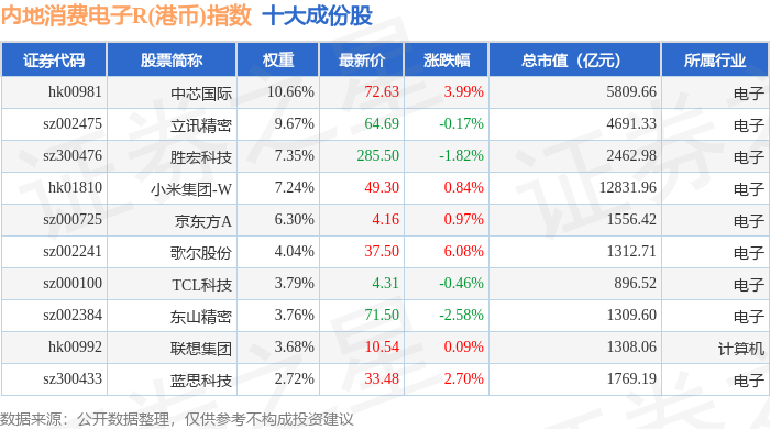 内地消费电子R(港币)(483106)指数十大成份股详情如下: