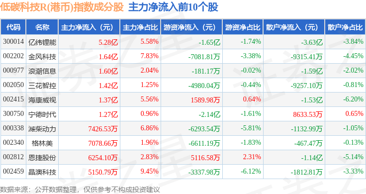 资金流向方面,低碳科技R(港币)(483161)指数成份股当日主力资金净流出合计34.27亿元,游资资金净流入合计12.78亿元,散户资金净流入合计21.49亿元。成份股资金流向详情见下表: