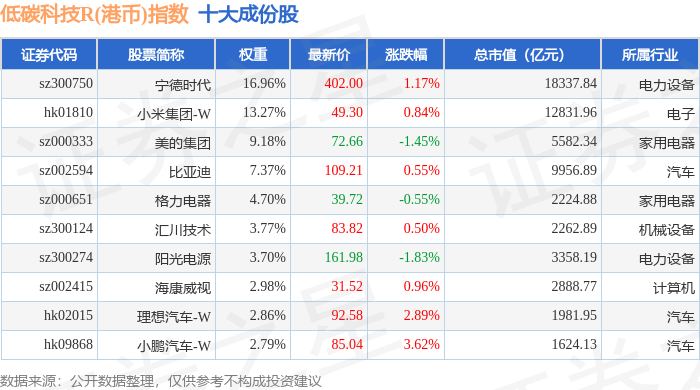低碳科技R(港币)(483161)指数十大成份股详情如下: