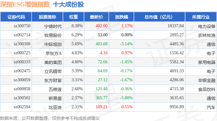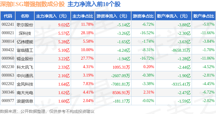 资金流向方面,深指ESG增强(970032)指数成份股当日主力资金净流出合计169.44亿元,游资资金净流入合计56.34亿元,散户资金净流入合计113.1亿元。成份股资金流向详情见下表: