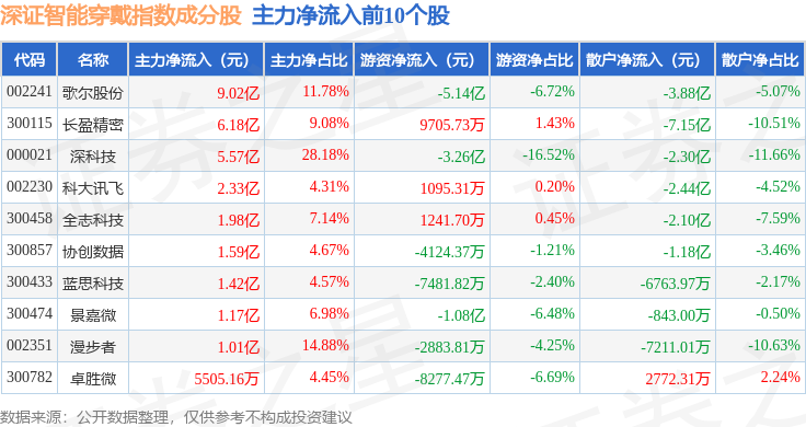 资金流向方面,深证智能穿戴(970074)指数成份股当日主力资金净流出合计22.19亿元,游资资金净流入合计6.9亿元,散户资金净流入合计15.3亿元。成份股资金流向详情见下表:
