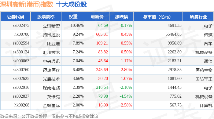 深圳高新(港币)(980039)指数十大成份股详情如下: