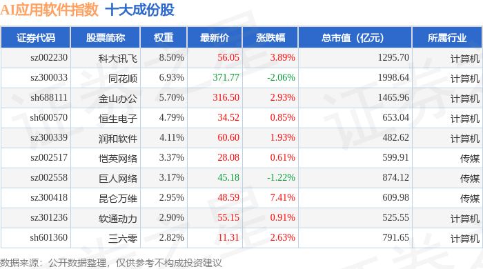 证券之星消息,9月30日,AI应用软件(980107)指数报收于1738.64点,涨1.71%,成交598.02亿元,换手率3.36%。当日该指数成份股中,上涨的有38家,昆仑万维以7.41%的涨幅领涨,下跌的有11家,神州泰岳以2.19%的跌幅领跌。