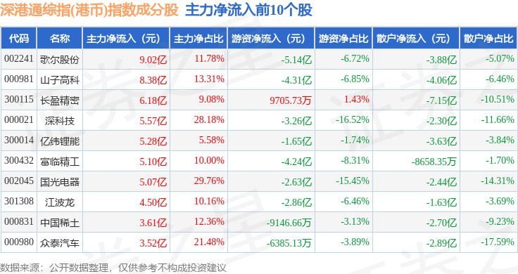 资金流向方面,深港通综指(港币)(983006)指数成份股当日主力资金净流出合计251.0亿元,游资资金净流入合计52.19亿元,散户资金净流入合计198.81亿元。成份股资金流向详情见下表: