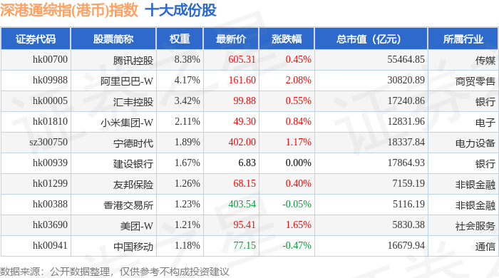 深港通综指(港币)(983006)指数十大成份股详情如下: