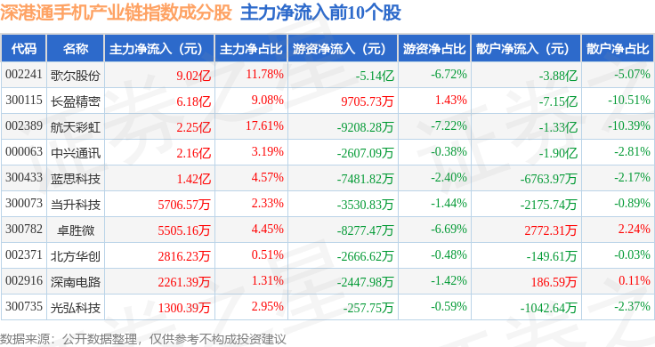 资金流向方面,深港通手机产业链(983009)指数成份股当日主力资金净流出合计55.35亿元,游资资金净流入合计22.06亿元,散户资金净流入合计33.29亿元。成份股资金流向详情见下表: