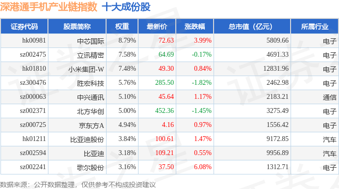 深港通手机产业链(983009)指数十大成份股详情如下: