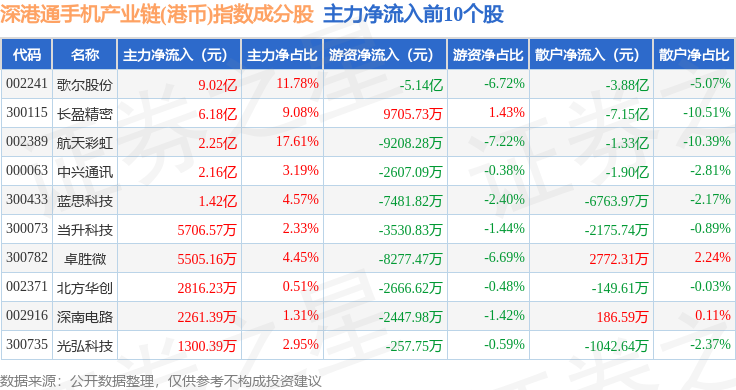 资金流向方面,深港通手机产业链(港币)(983010)指数成份股当日主力资金净流出合计55.35亿元,游资资金净流入合计22.06亿元,散户资金净流入合计33.29亿元。成份股资金流向详情见下表: