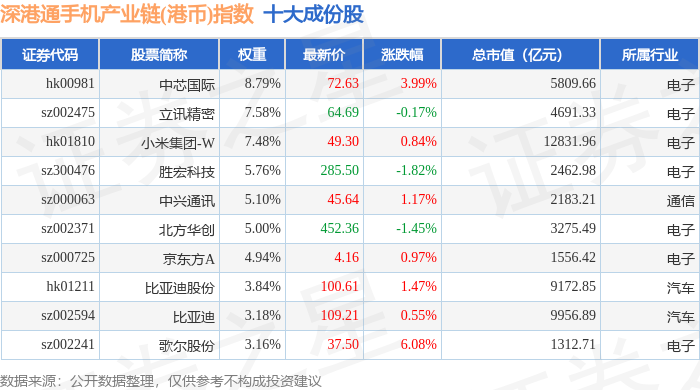 深港通手机产业链(港币)(983010)指数十大成份股详情如下: