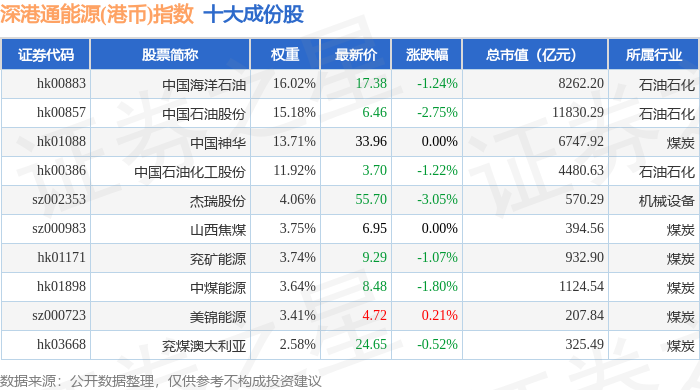 深港通能源(港币)(983014)指数十大成份股详情如下: